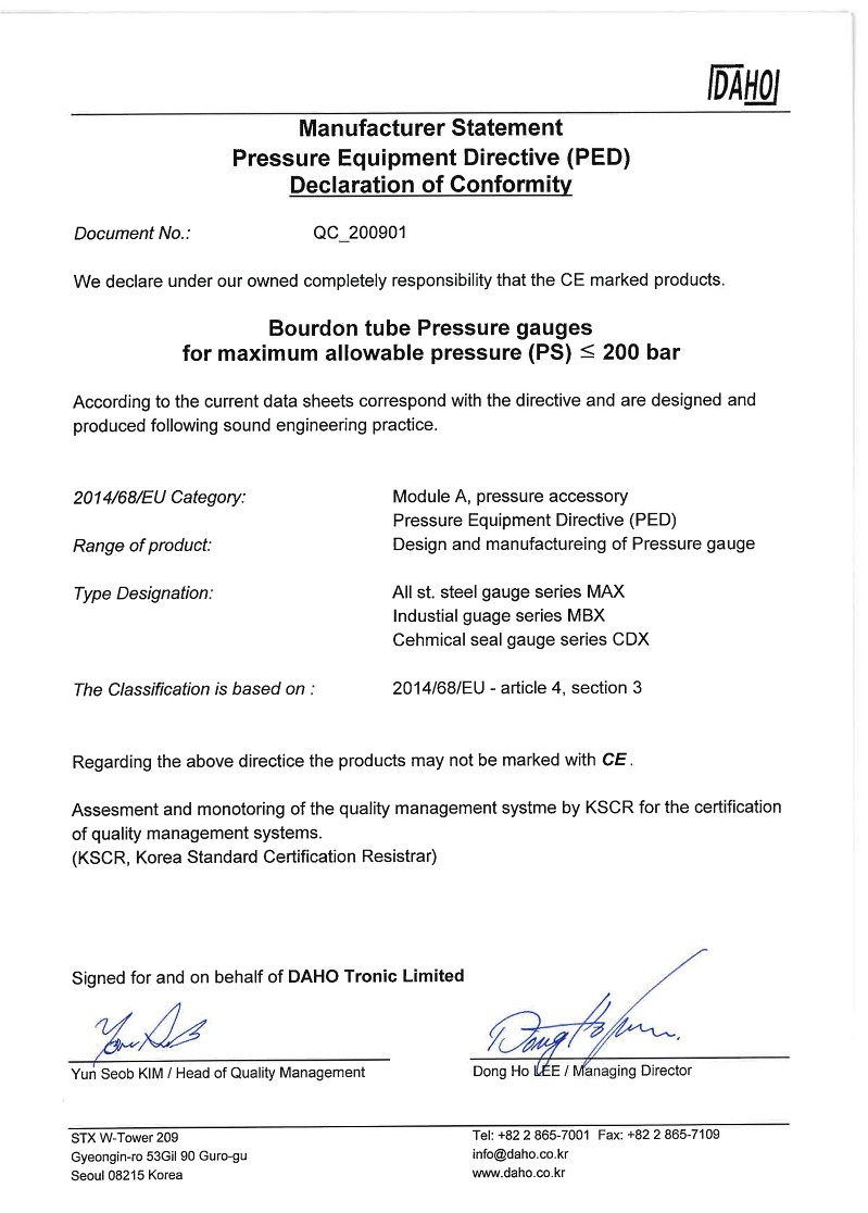 Manufacturer Statement Pressure Equipment Directive (PED) Declaration of Conformity -