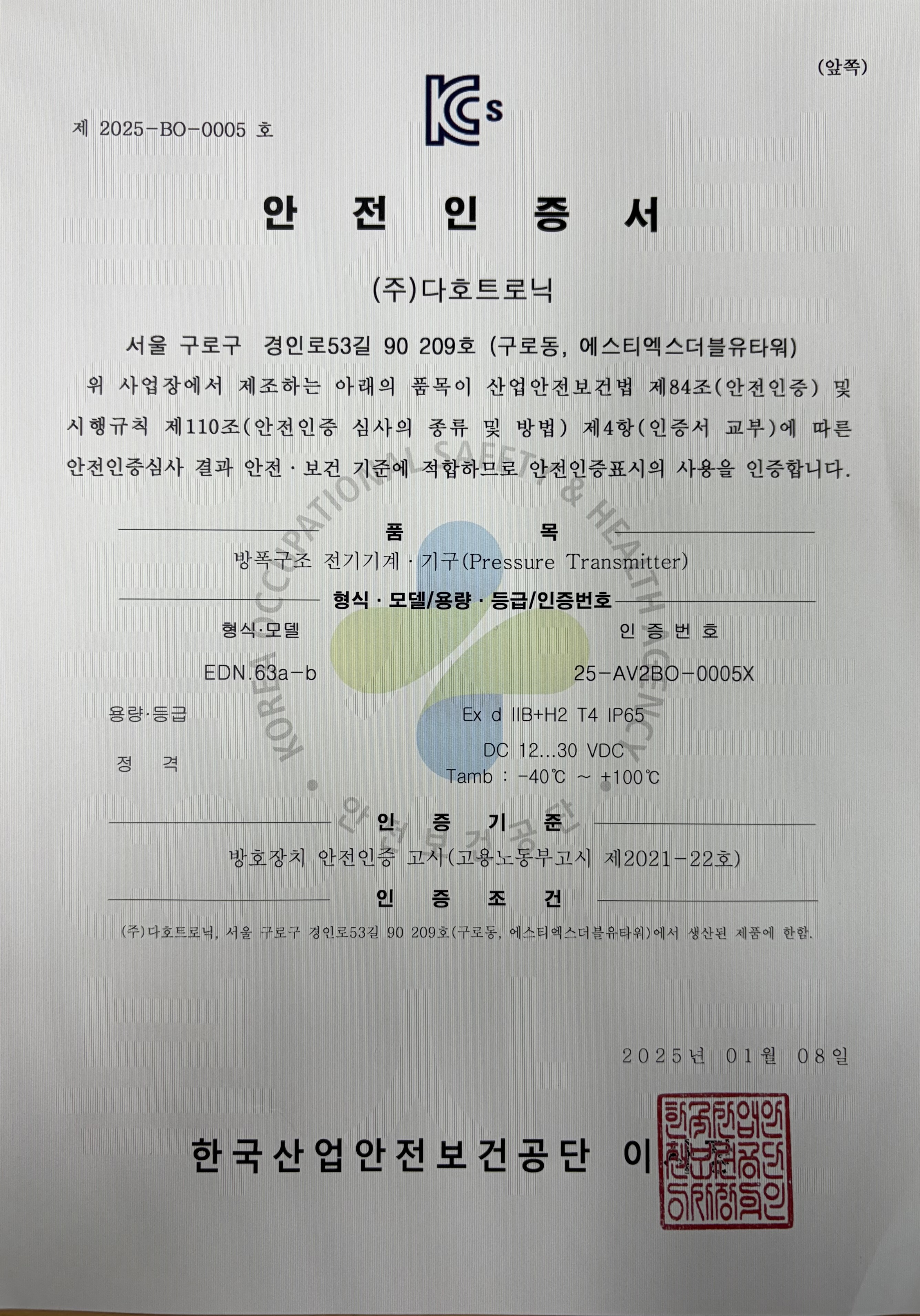 국내 KOSHA의 내압폭발을 인증해 수소압력을 반영구적으로 측정하는 압력트랜스미터를 출시했습니다. [상품명 : EDN.630]